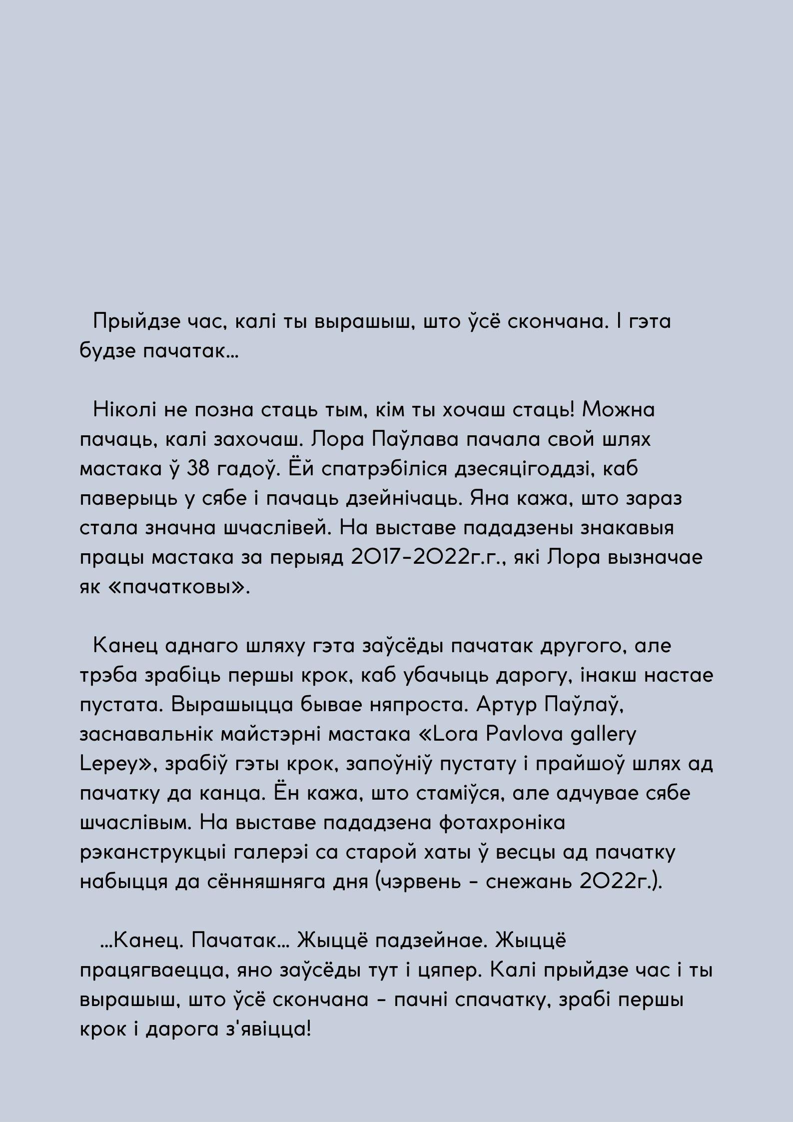 22 декабря 2022 года на открытии сельской мастерской художницы Лоры Павловой «Галереи Лепей» состоялось открытие ее выставки-ретроспективы «Начало». Выставка доступна по предварительной записи до конца лета 2023г.