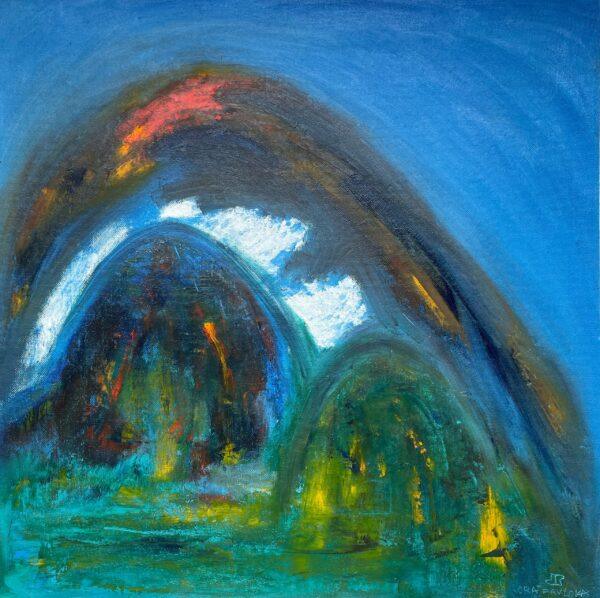 На этом полотне в стиле абстракционизма изображена атмосфера вечера в деревне, переданная через глубокие синие и зеленые тона. Использование цвета и формы создает ощущение покоя и умиротворенности, погружая зрителя в интимную атмосферу природы в сумерках. Работа вызывает задумчивость и вдохновляет на размышления о связи человека с окружающей средой.