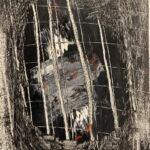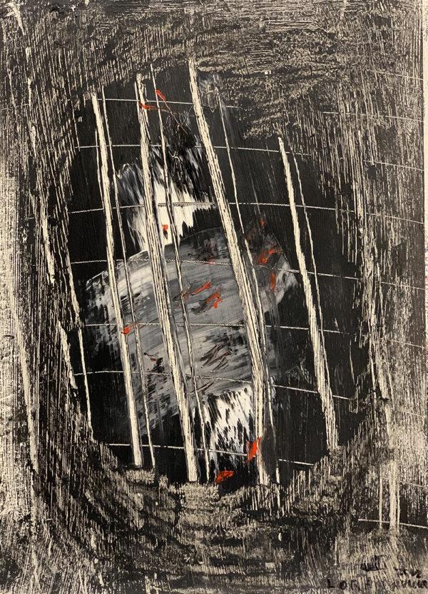 Эта картина передает драму и внутренние переживания героини, запертой в тюрьме своей судьбы. Использование черного, белого и красного цветов усиливает контраст между свободой и ограничением, жизнью и борьбой. Абстрактные формы открывают пространство для глубоких размышлений о судьбе женщины.