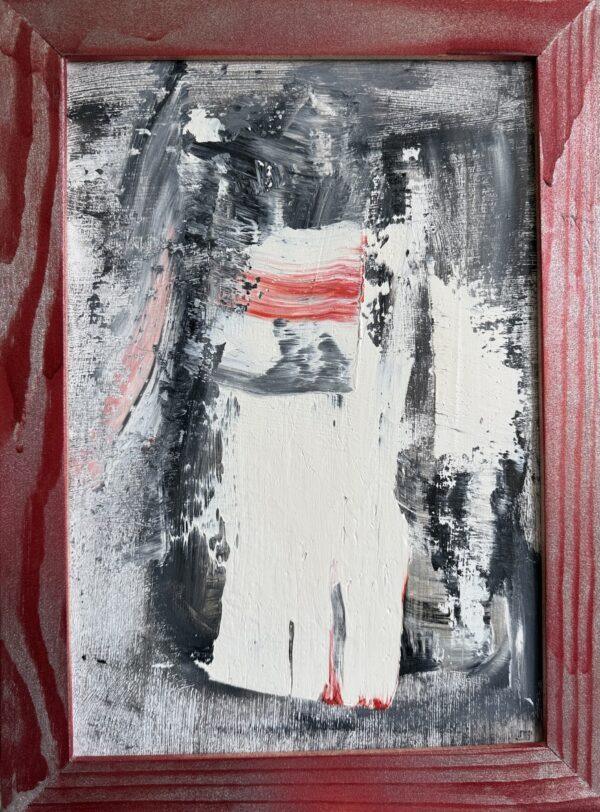 Эта картина представляет собой мощную игру контрастов, где красный, белый и черный цвета переплетаются в абстрактных формах, вызывая ассоциации с борьбой и переменами. Образы, несмотря на минимализм, наполнены энергией и драматизмом, которые отсылают к внутренним переживаниям. Композиция стимулирует зрителя к размышлениям о силе, конфликте и гармонии в сложном мире эмоций и времени.